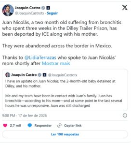 “Deportar desnecessariamente um bebé doente e toda a sua família é um ato hediondo”, afirmou Castro, garantindo que a sua equipa está focada em localizar a família, garantir a sua segurança e responsabilizar o ICE por esta ação.